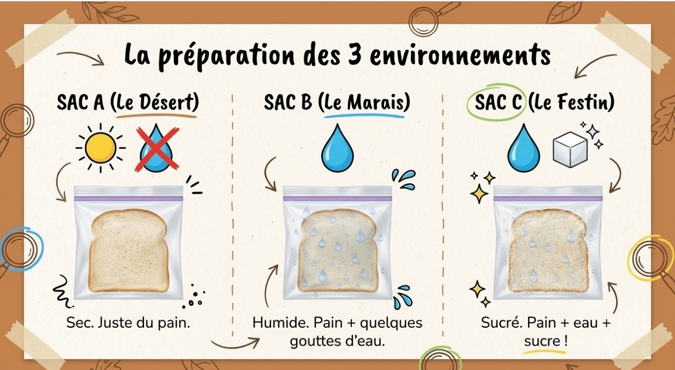 Activité scientifique pour observer la réaction des champignons dans différents milieux.