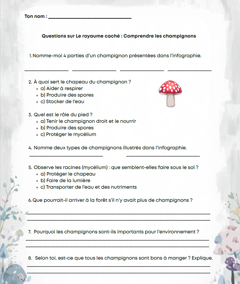 Ce ensemble pédagogique invite les élèves à découvrir le règne fascinant des champignons à travers une série d’activités variées et stimulantes. Il combine l’observation scientifique, la compréhension des notions clés et l’analyse critique de documents littéraires. Conçu pour rendre l’apprentissage concret et engageant, ce matériel est idéal pour accompagner vos vidéos sur les champignons et enrichir vos séances en classe ou à la maison. Chaque activité est prête à l’emploi et inclut des outils pour guider l’enseignant ou le parent, tout en favorisant l’autonomie des élèves.