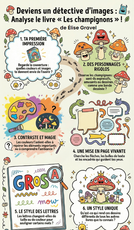 Guide pour analyser l’aspect visuel du livre : choix des caractères, style des personnages, illustrations.