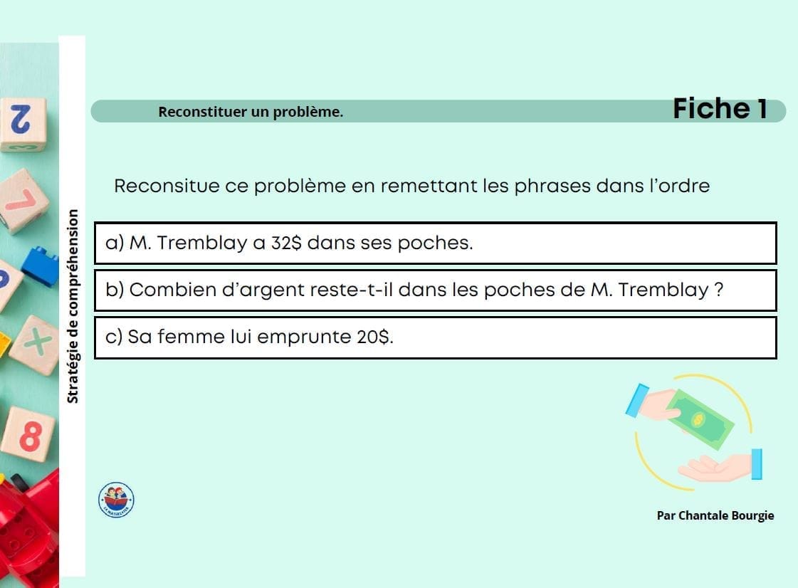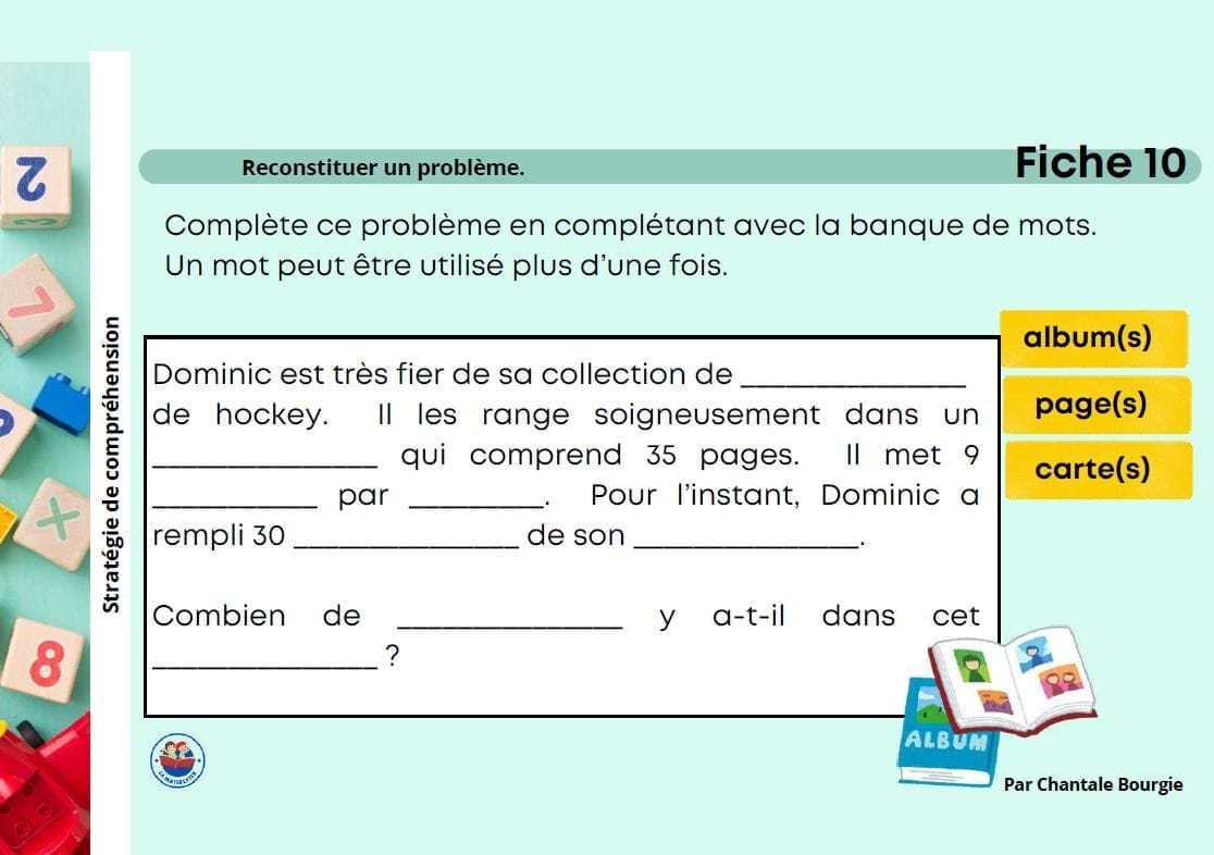 12 fiches d’activités où les élèves doivent remettre les phrases d’un problème dans le bon ordre ou compléter un énoncé à partir d’une banque de mots.